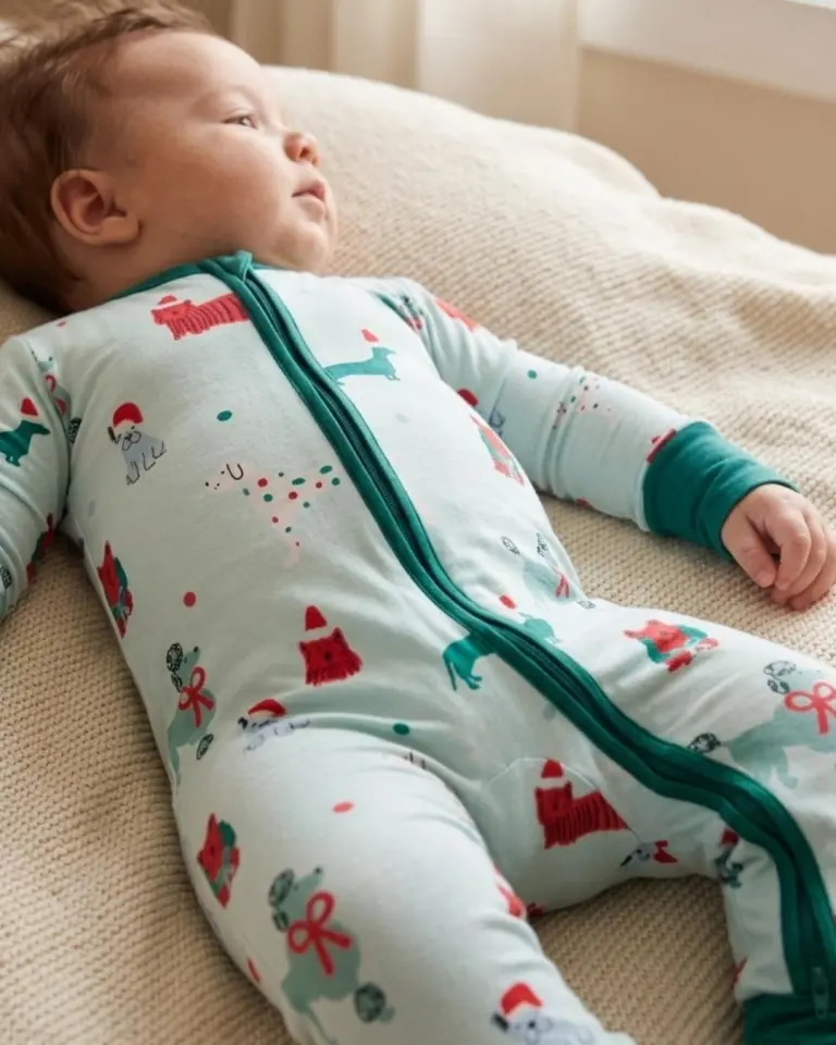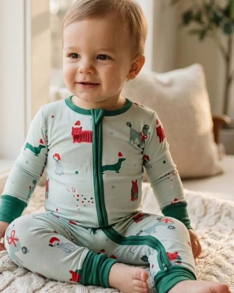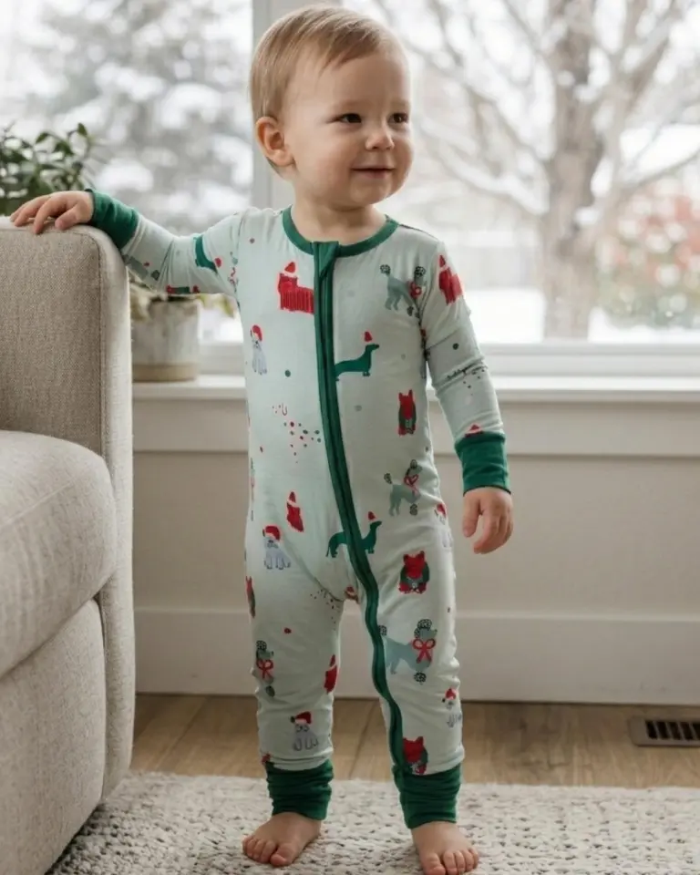 Buttery-soft bamboo convertible footie in the Holiday Pups print, perfect for Christmas photos and cozy mornings.
